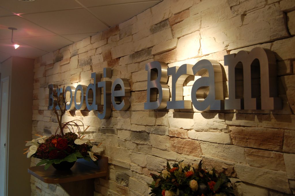 Deze gevelreclame op een binnenmuur zijn gemaakt van RVS doosletters met profiel 01P. Dit zijn onverlichte letters in geslepen zilver.