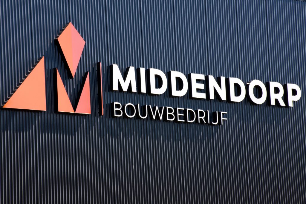 Opvallende doosletters met profiel 5! Dit bouwbedrijf is ook in het donker nog van een afstand goed te zien.