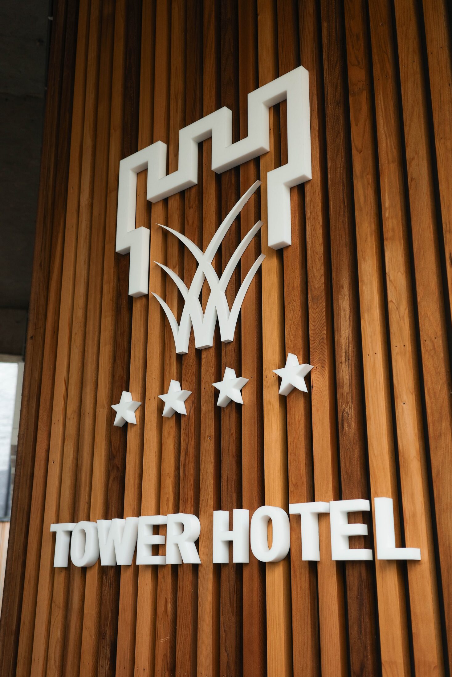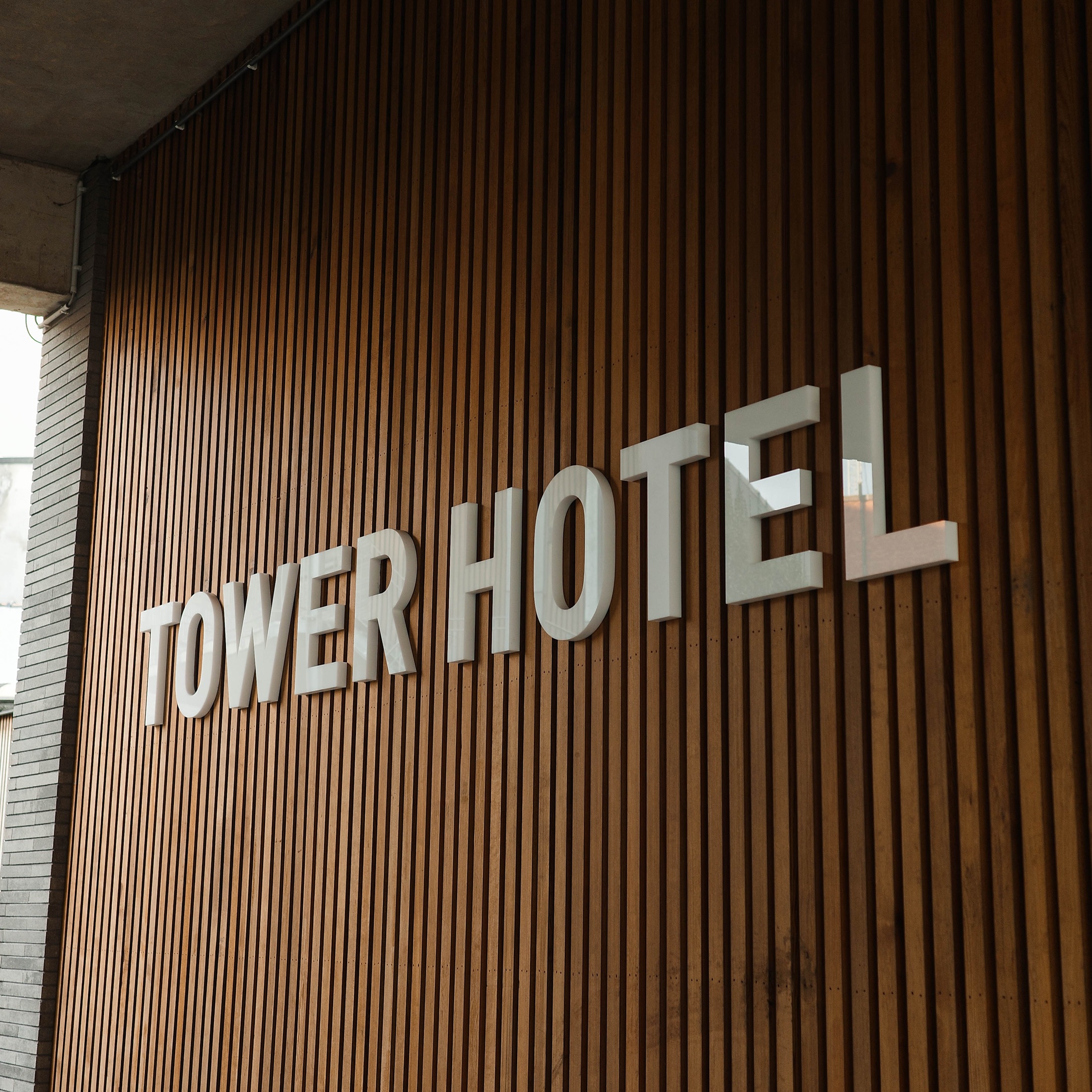 De gevelletters voor TOWER HOTEL zijn uitgevoerd in 30mm Acrylox wit glans. Het logodeel is gemaakt in 19mm Acrylox wit glans.
